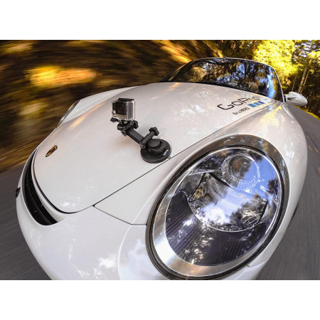 Fija la GoPro a coches, barcos, motos y otros vehículos. El soporte con ventosa tiene una capacidad de succión de nivel industrial y ha sido sometido a pruebas de velocidades superiores a 240 km/h; además, presenta una gran estabilidad y una amplia variedad de movimientos. Los brazos ajustables permiten un montaje ultracompacto. Incluye una base estándar y una base de apertura rápida para reubicarlo cómodamente entre toma y toma. Para obtener la fuerza máxima de sujeción, fíjalo a una superficie limpia.