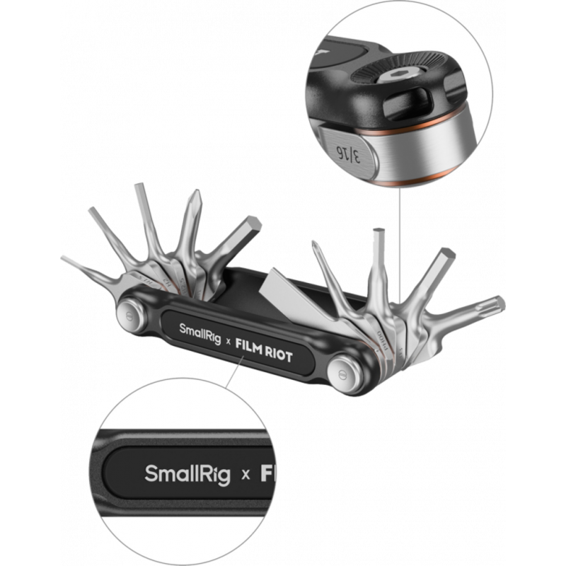 El kit de herramientas múltiples plegable 10 en 1 SmallRig x FILM RIOT es una solución compacta y versátil diseñada para cineastas y fotógrafos. Con un diseño estructural patentado, cada llave se puede colocar de forma segura a 90° o 180°, lo que facilita el montaje y desmontaje eficientes de los accesorios antes y después del rodaje.