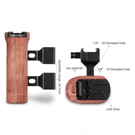 El mango lateral de madera NATO 2187B de SmallRig está diseñado para proporcionar un disparo manual cómodo a los camarógrafos. Se bloquea mediante una abrazadera NATO para que su configuración se suelte rápidamente y se adapta a cualquier jaula con riel NATO en el lateral. Un hexágono incorporado en la parte superior para ajustar el mango hacia arriba y hacia abajo según sus necesidades. Si desea usarlo en el otro lado de la jaula, use el hexágono para quitar la parte metálica de conexión del mango y cambie la dirección. El mango de liberación rápida cuenta con una zapata fría y orificios roscados de 1/4 ”-20 y 3/8” -16 en la parte superior que le permiten montar otros accesorios.