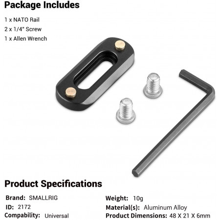 - 【THINNESS】 Para que su configuración sea más compacta y liviana, diseñamos SMALLRIG NATO Rail 2172. Solo tiene 6 mm de grosor y solo pesa 10 gramos.