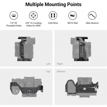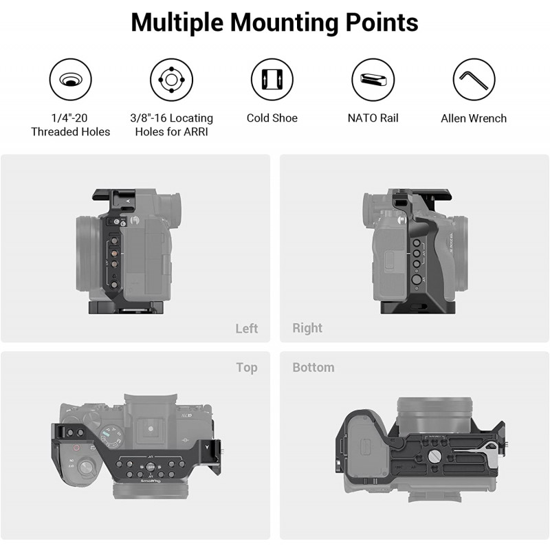 Múltiples puntos de montaje: la cage cuenta con un soporte de zapata integrado, múltiples roscas de 1/4"-20 y un orificio de ubicación de 3/8"-16 para ARRI. La cage también tiene un NATO rail incorporado en el costado, y también cuenta con ranuras para correa para una correa para el cuello o una correa para la mano disponibles por separado. Un destornillador magnético de cabeza plana y una llave Allen se almacenan en la parte inferior de la jaula para asegurar el tornillo de montaje