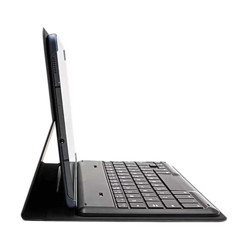 Integrado en la cubierta hay un teclado de tamaño completo con capacidad de respuesta que se conecta instantáneamente con tu tableta, lo que proporciona una experiencia de escritura cómoda y familiar. Dile adiós a los torpes teclados en pantalla y hola a la edición eficiente de documentos, la composición de correo electrónico y la toma de notas.