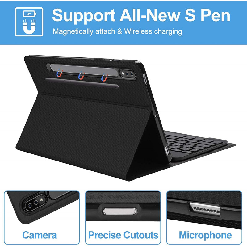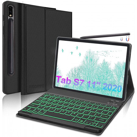 【Teclado desmontable magnéticamente retroiluminado de 7 colores】 Este teclado Bluetooth con retroiluminación de 7 colores y 3 niveles de brillo, que es conveniente para escribir cuando está de noche y puede brindarle un disfrute visual diferente. La funda con teclado Bluetooth para Samsung Galaxy Tab S7 11 '' 2020 con imán, puede quitar o ajustar fácilmente la ubicación del teclado
