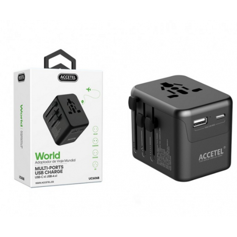 El Adaptador de Viaje Internacional Accetel UC606B es la solución definitiva para el viajero moderno, garantizando que sus dispositivos estén siempre listos para usar, sin importar su destino. Diseñado para una compatibilidad global, este enchufe de viaje universal se adapta a tomas de corriente en más de 150 países, abarcando las regiones de Norteamérica, Europa, Reino Unido, Australia y muchas otras.