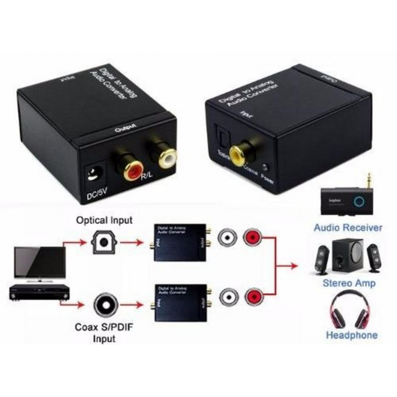 Permite transformar la señal de audio digital, como la que proviene de televisores inteligentes, reproductores de Blu-ray o consolas de videojuegos, en una señal de audio estéreo analógica de dos canales (2RCA), haciendo posible la conexión a amplificadores, sistemas de sonido o receptores que no dispongan de entradas digitales.