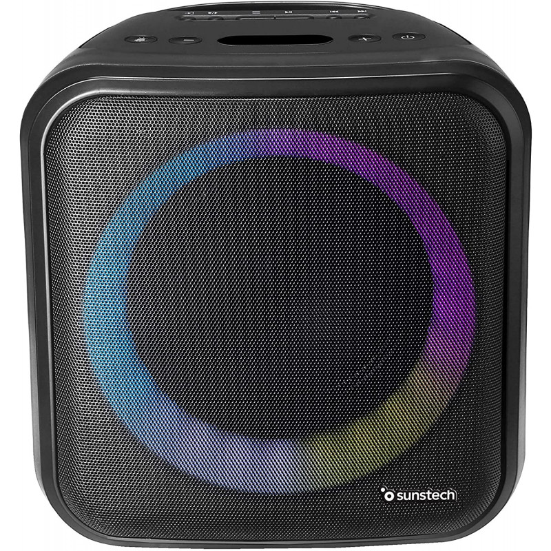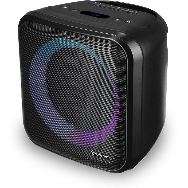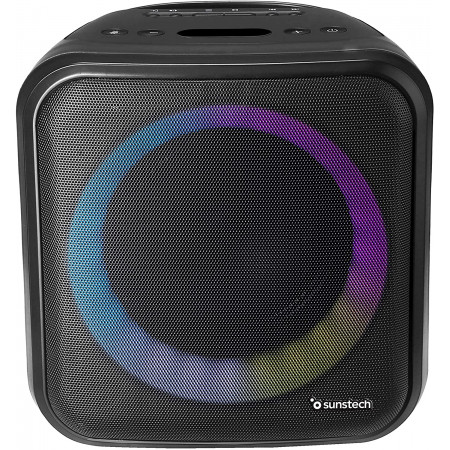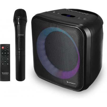 Altavoz de 20W con iluminación LED, Bluetooth, Radio FM, USB, Micro SD y aux-in. Incorpora micrófono y mando a distancia.