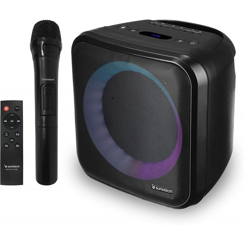 micrófono incluido y mando a distancia que no te corten el rollo; ahora muscle cube incluye un mando a distancia para que no tengas que preocuparte por dejar lo que estas haciendo si quieres cambiar de modo o de pista de reproducción; además, incluye un micrófono inalámbrico de regalo para que cantes mientras reproduces tu música favorita; incorpora conexiones para micrófono y guitarra