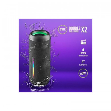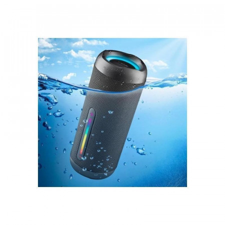 Su diseño robusto con material de tela resistente y certificación IPX7 lo hacen resistente al agua, permitiéndote disfrutar de tu música incluso en ambientes húmedos o cerca de la piscina. Además, sus luces RGB añaden un toque de diversión y ambiente a tus reuniones.