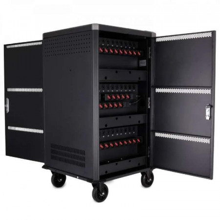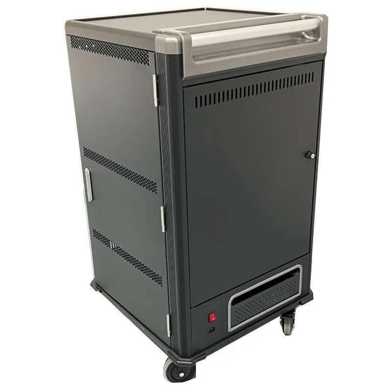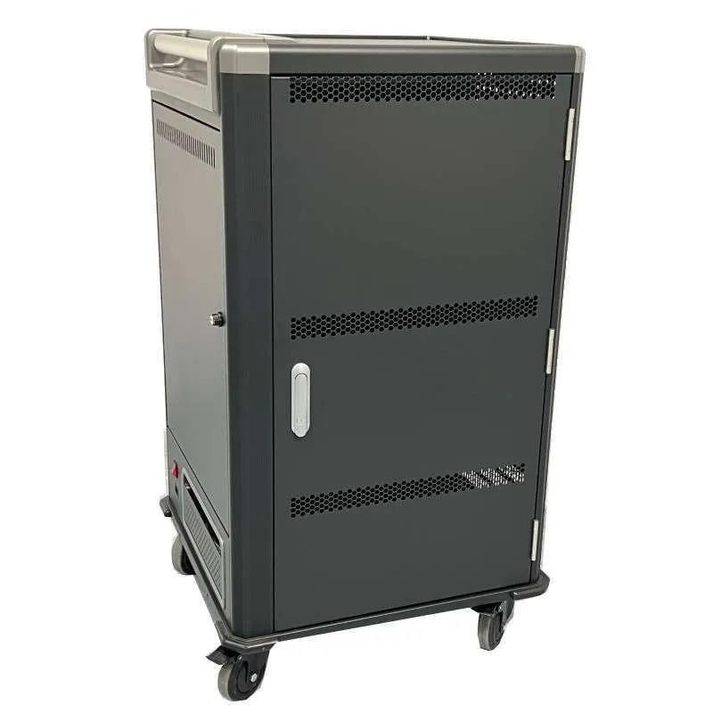 Su construcción metálica robusta garantiza la durabilidad y seguridad de los dispositivos almacenados. Las ruedas con freno permiten un fácil desplazamiento, mientras que las cerraduras en todas las puertas y la protección eléctrica integrada brindan una mayor seguridad contra robos y daños eléctricos.