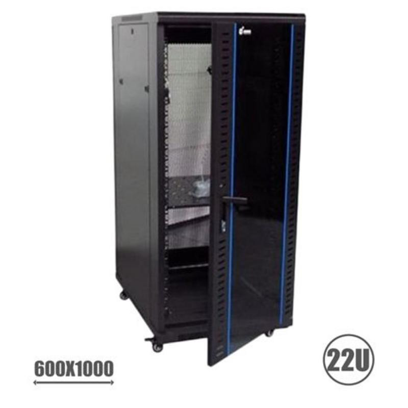 - Capacidad y Dimensiones: Ofrece 22 unidades de rack, con unas medidas de 600mm de ancho, 1000mm de fondo y 1080mm de alto, optimizado para espacios reducidos.