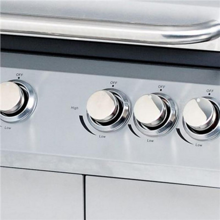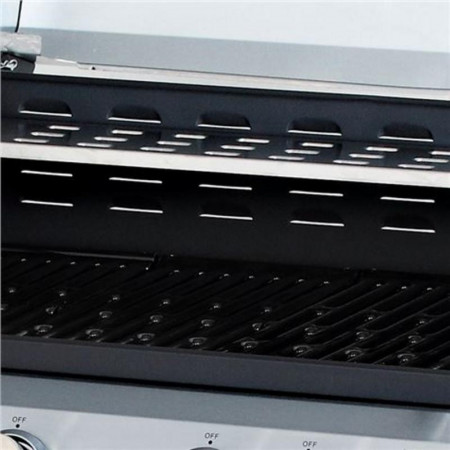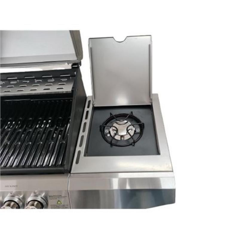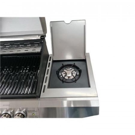 Su estructura de acero inoxidable no solo le otorga un aspecto moderno y profesional, sino que también garantiza una excelente resistencia a la intemperie y una limpieza sencilla. Equipada con cuatro quemadores centrales de alto rendimiento y un quemador lateral adicional, ofrece la versatilidad necesaria para preparar desde carnes y pescados hasta guarniciones, todo al mismo tiempo y con un control de temperatura óptimo.
