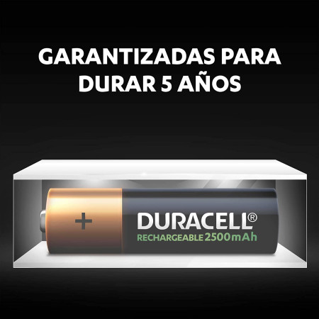 - Las baterías Duracell recargables AA de 2500 mAh permanecen cargadas en estado sin usar durante un período de hasta 12 meses.