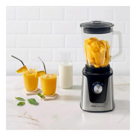 Prepara tus recetas favoritas con la máxima eficiencia gracias a la batidora de vaso Ufesa Moonstone. Diseñada para ofrecer un rendimiento superior, cuenta con una impresionante potencia de 1500W que te permitirá triturar, mezclar y picar todo tipo de ingredientes, desde frutas y verduras hasta hielo, con resultados profesionales en cuestión de segundos.
