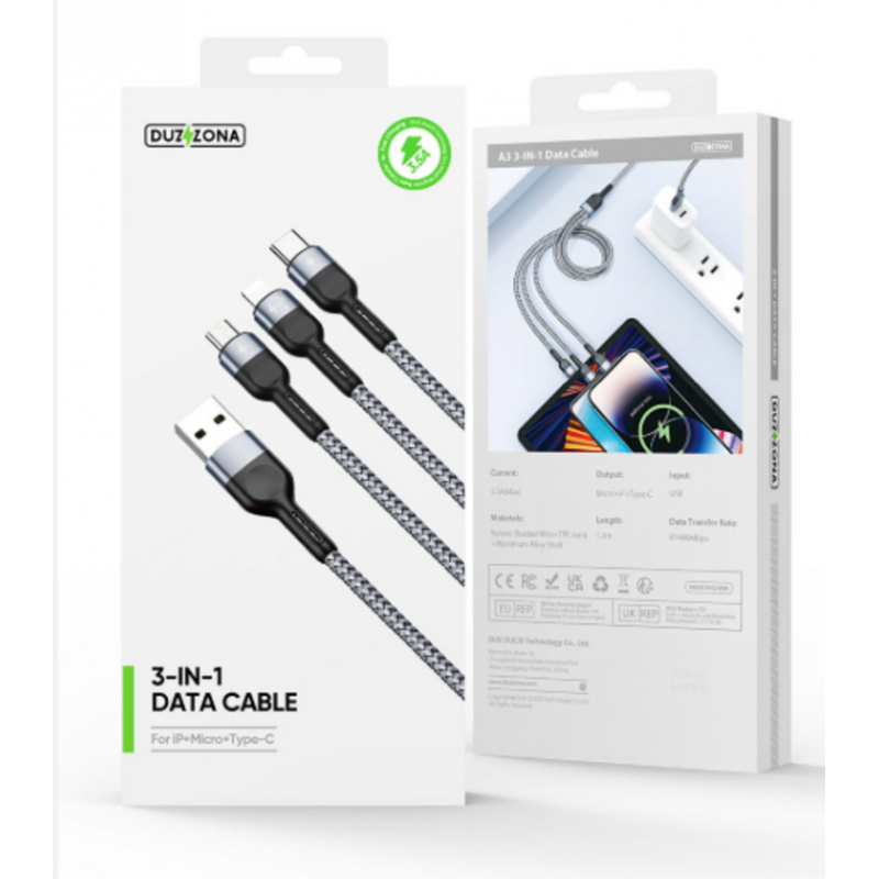 El cable Duzzona A3-01 es la solución definitiva para mantener todos tus dispositivos cargados y listos para usar, eliminando la necesidad de llevar múltiples cables. Diseñado para ofrecer máxima comodidad y eficiencia, integra tres de los conectores más comunes en un único cable resistente y de alta calidad.