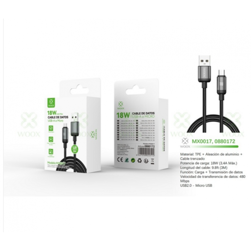 El Cable de Datos Woox USB a Micro USB (MX0017) es un accesorio esencial para la carga y sincronización de una amplia gama de dispositivos electrónicos. Diseñado para ofrecer una transferencia de energía eficiente, soporta hasta 18W, lo que permite cargar tus dispositivos de forma más rápida.