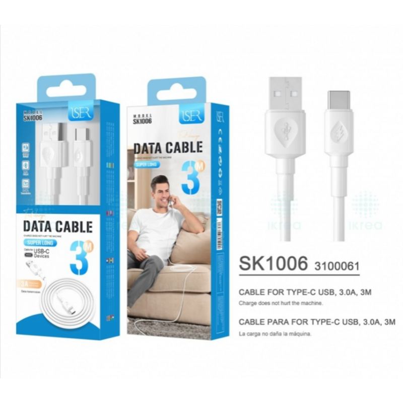El Cable Iser Type-C SK1006 es un accesorio indispensable para optimizar la carga y la transferencia de datos de tus dispositivos modernos. Diseñado para ofrecer la máxima funcionalidad, este cable cuenta con una longitud generosa de 3 metros, proporcionando una gran flexibilidad y comodidad en cualquier entorno, ya sea en casa, la oficina o de viaje.