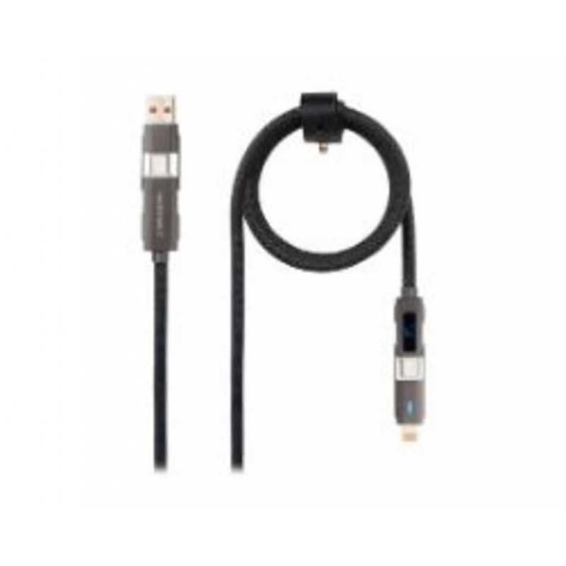 Descubre el cable Nanocable multi-conector USB-C 2.0, ideal para una carga rápida de 27W. Incluye display digital para monitorizar la potencia y conectores USB-C + USB-A a Lightning + USB-C, ofreciendo máxima versatilidad en 1 metro de longitud y elegante diseño negro.