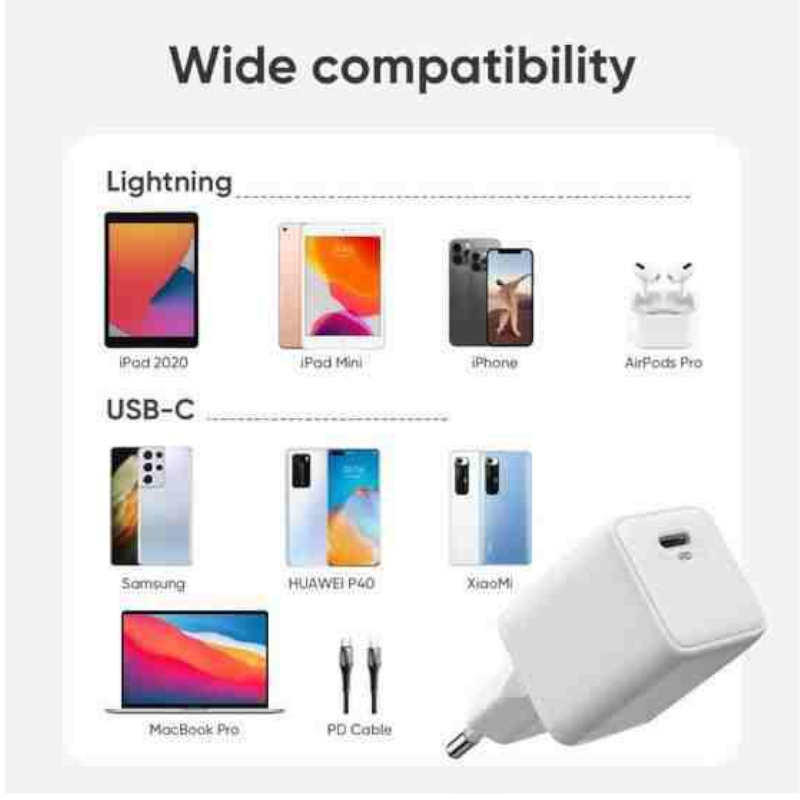 Para una gama completa de la función de carga rápida de PD 20W de iPhone 12, y para la función de carga rápida de PPS 25W de los teléfonos móviles de Samsung