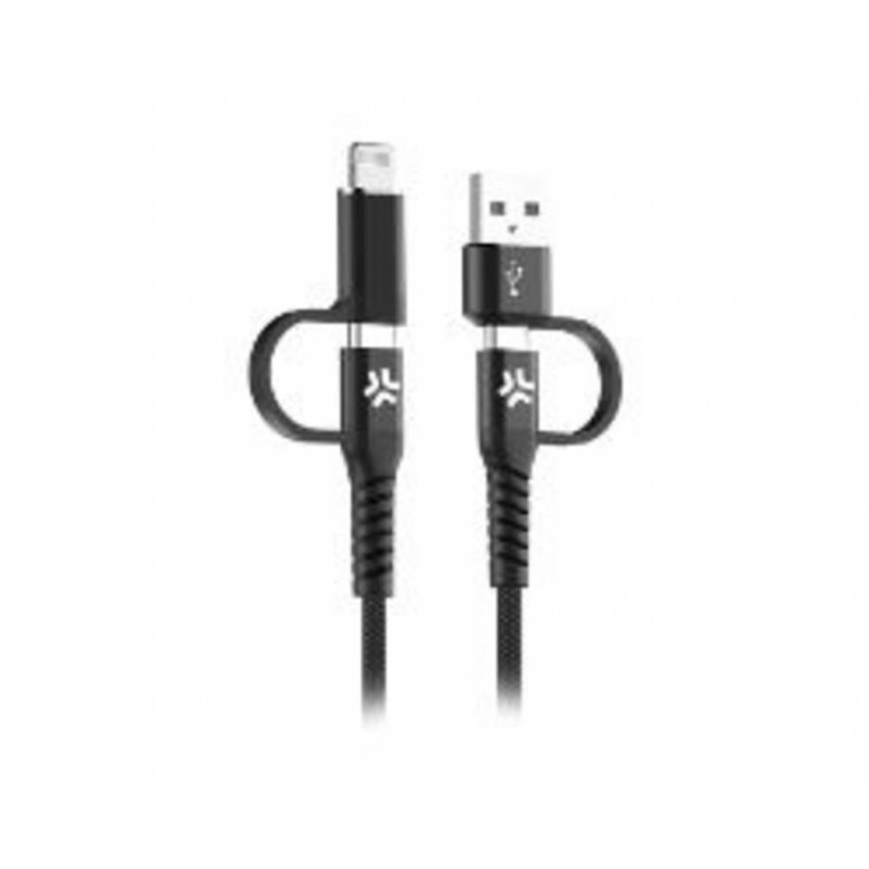 El cable CELLY 4en1 te ofrece la máxima versatilidad. Conecta dispositivos USB-A/C a USB-C/Lightning con una potencia de 35W y una longitud de 2 metros. Ideal para carga y transferencia de datos, este cable negro (USBC4IN1BK) es tu solución todo en uno.