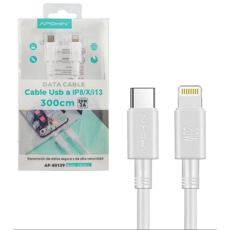 El cable Apokin USB-C a Lightning de 300 cm con 20W (AP-80129) ha sido diseñado para ofrecer una carga rápida y una transferencia de datos eficiente para tus dispositivos Apple. Su generosa longitud de 3 metros proporciona una flexibilidad inigualable, permitiéndote usar tu dispositivo cómodamente mientras se carga, incluso si la toma de corriente está lejos.