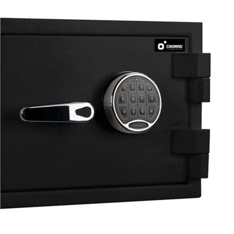 Fabricada con acero de alta resistencia y un innovador sistema anti-palanca, la Cromad E14450 está diseñada para resistir intentos de intrusión. Su cerradura electrónica con teclado digital EASTHOUSE (EN1300) ofrece un acceso seguro y personalizable, mientras que su certificación ECB·S valida su conformidad con las normativas europeas, siendo apta para cobertura de seguros. Con ella, podrá salvaguardar documentos importantes, dinero en efectivo, dispositivos electrónicos y joyas con total confianza.