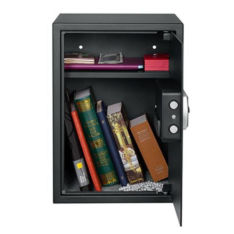 Esta caja fuerte está construida para resistir intentos de intrusión gracias a su fabricación en acero de alta calidad y un acabado resistente a rayones que mantiene su estética impecable a lo largo del tiempo. Sus bisagras ocultas proporcionan una protección adicional, dificultando cualquier intento de manipulación.