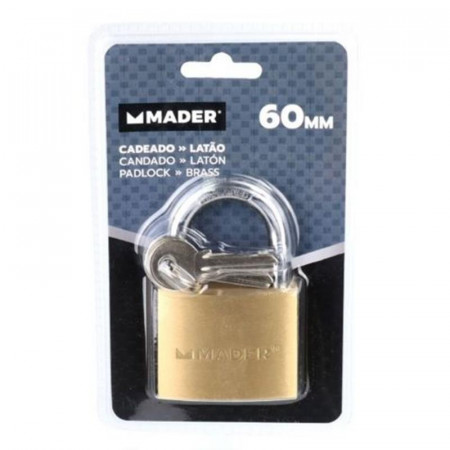 Este robusto candado de latón Mader, con un ancho de 60 mm, es la solución ideal para proteger tus objetos de valor y asegurar tus espacios. Diseñado para ofrecer una seguridad fiable y duradera, combina materiales de alta calidad con un mecanismo de cierre avanzado.
