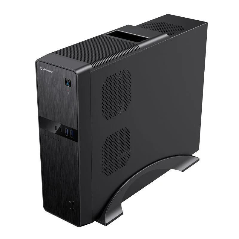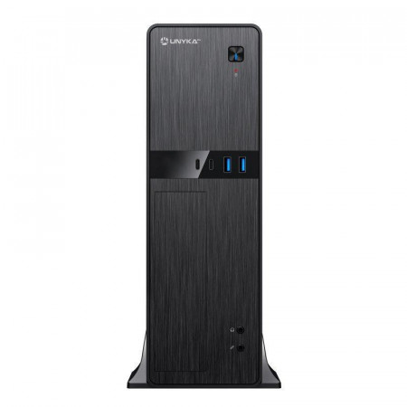 La caja para ordenador Unykach UK52112 ofrece un diseño compacto SFF (Small Form Factor) ideal para entornos donde el espacio es limitado. Su frontal presenta un elegante acabado con efecto aluminio, que le proporciona un aspecto moderno y profesional.
