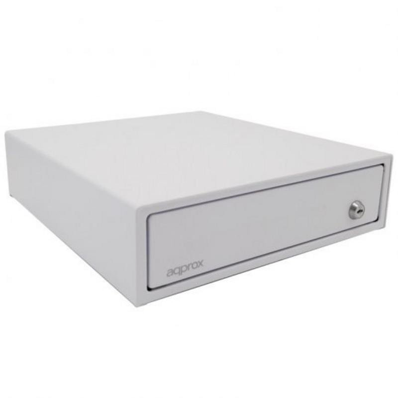 Cajón portamonedas de dimensiones 330x360 mm, diseñado en color blanco para integrarse fácilmente en cualquier entorno de punto de venta. Este cajón ofrece una solución práctica y segura para la gestión del efectivo en comercios y negocios.