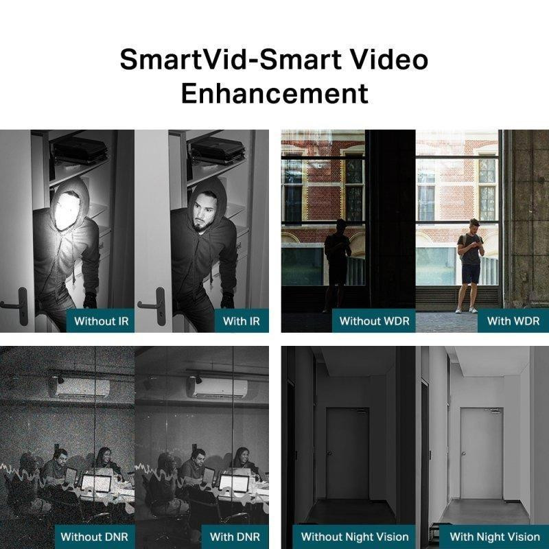 Para una vigilancia ininterrumpida, esta cámara incorpora la mejora inteligente de video SmartVid, que combina tecnologías como Smart IR, WDR (Wide Dynamic Range), 3D DNR y Night Vision para optimizar la calidad de imagen en diversas condiciones de iluminación. Disfruta de una visión nocturna clara hasta 30 metros gracias a su iluminación IR.
