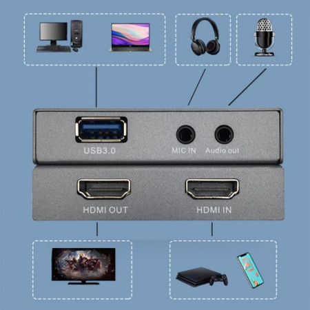 Esta capturadora de video multifuncional está diseñada para facilitar la grabación y el streaming de contenido de alta calidad. Permite la conexión simultánea de dos fuentes HDMI, lo que la hace ideal para escenarios que requieren la mezcla de múltiples señales de video, como transmisiones de juegos, conferencias o tutoriales con varias cámaras.