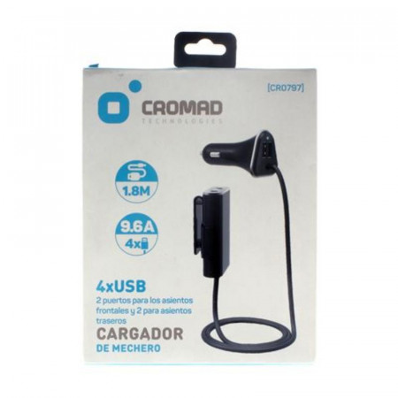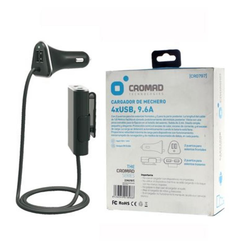 Mantén todos tus dispositivos cargados durante tus viajes con el versátil cargador de mechero Cromad. Diseñado para la comodidad de todos los ocupantes del vehículo, este cargador inteligente cuenta con una potencia total de 9.6A, distribuida de manera óptima a través de sus cuatro puertos USB.