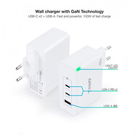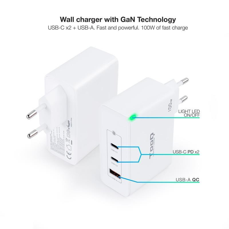 El cargador de pared Tooq de 100W ofrece una solución de carga rápida y eficiente para una amplia gama de dispositivos. Equipado con tecnología GaN (Nitruro de Galio), este cargador minimiza la generación de calor y maximiza la eficiencia energética, permitiendo un diseño más compacto.