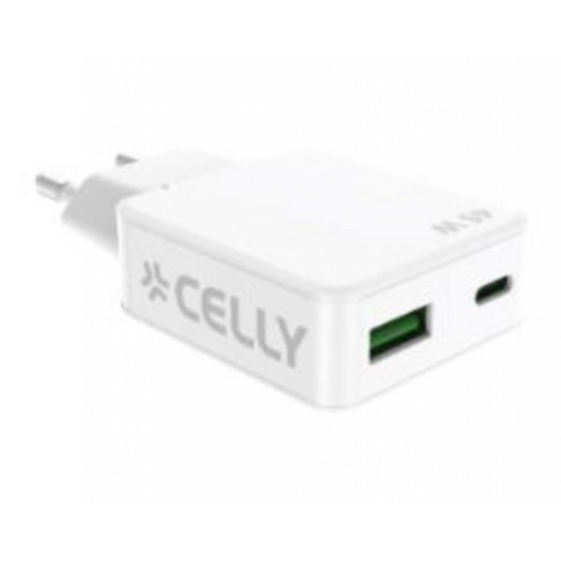 Cargador CELLY Slim GaN de 45W con 1 puerto USB-A y 1 puerto USB-C. Ideal para cargar tus dispositivos de forma rápida y eficiente. Color Blanco.