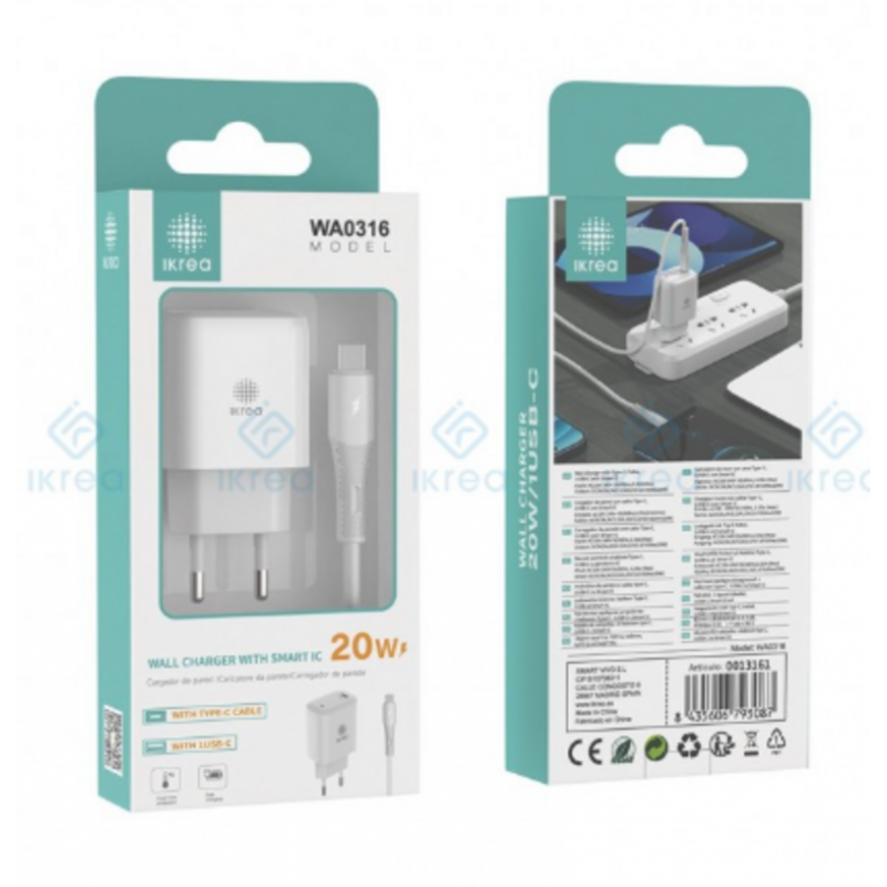 El cargador Ikrea Rápido modelo WA0316 es la solución ideal para mantener tus dispositivos siempre con energía. Diseñado para ofrecer una carga ultrarrápida, cuenta con un puerto USB-C compatible con la tecnología Power Delivery (PD) de 20W, asegurando que tus smartphones, tablets y otros dispositivos compatibles se carguen de manera eficiente y segura.