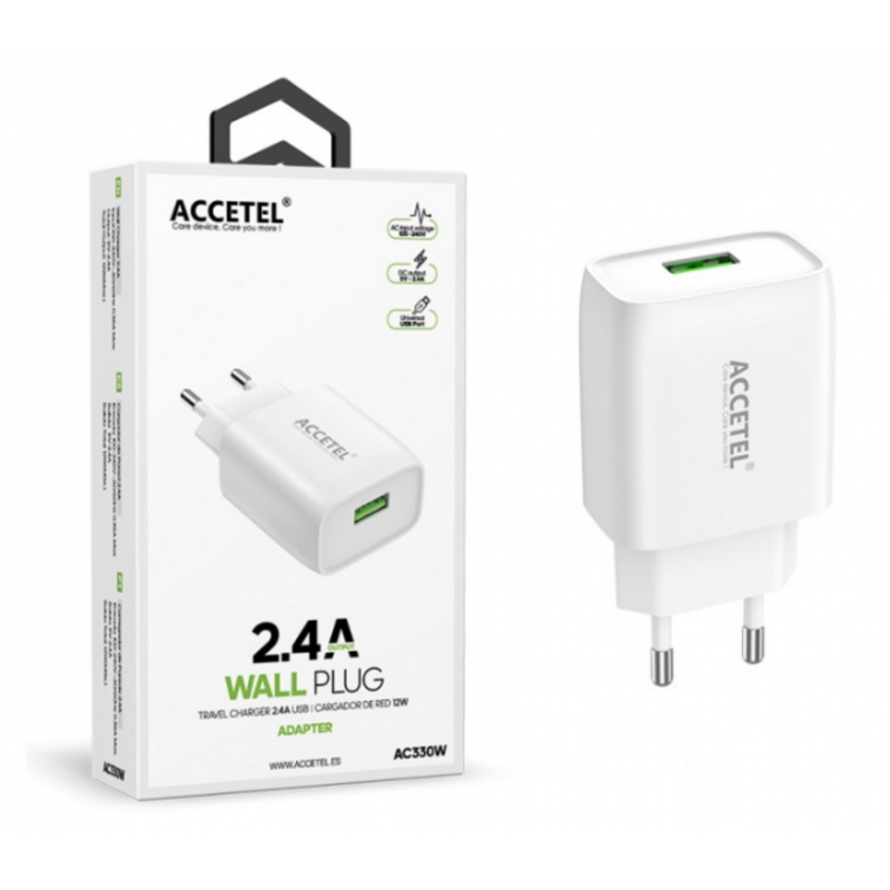 El cargador de pared Accetel AC330W es la solución ideal para mantener tus dispositivos móviles siempre listos. Con un diseño compacto y elegante en color negro, se integra discretamente en cualquier enchufe de pared. Ofrece una potencia de carga eficiente y segura para una amplia gama de smartphones, tablets y otros dispositivos compatibles con USB.