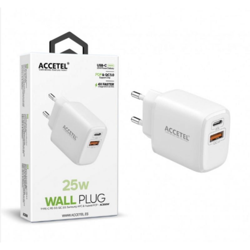 El cargador de pared Accetel AC550W redefine la eficiencia en la carga de tus dispositivos. Diseñado para ofrecer una experiencia de carga superior, este adaptador de 25W integra las avanzadas tecnologías Power Delivery (PD) 3.0 y Quick Charge (QC) 3.0, asegurando que tus smartphones, tablets y otros dispositivos compatibles reciban la energía que necesitan en el menor tiempo posible.