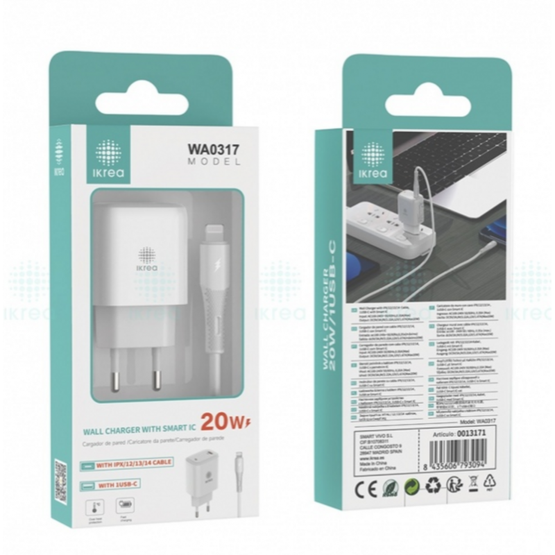 El cargador rápido Ikrea WA0317 de 20W está diseñado para ofrecer una solución de carga eficiente y segura para tus dispositivos Apple. Equipado con un puerto USB-C, este cargador es compatible con la tecnología Power Delivery (PD), lo que permite recargar tu iPhone o iPad a la máxima velocidad posible.