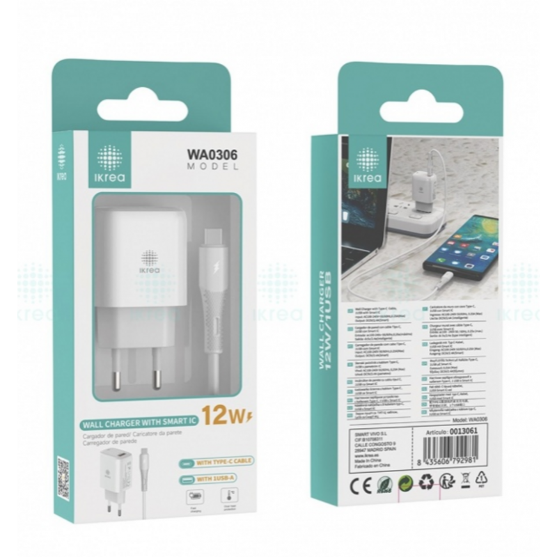 Optimiza tus tiempos de carga con el cargador rápido Ikrea WA0306. Este adaptador de corriente, diseñado para la eficiencia, cuenta con un puerto USB-A que entrega 12W de potencia, asegurando una carga eficaz para tus dispositivos compatibles. Su diseño en color blanco y tamaño compacto lo hacen perfecto para usar en casa, la oficina o llevar de viaje.