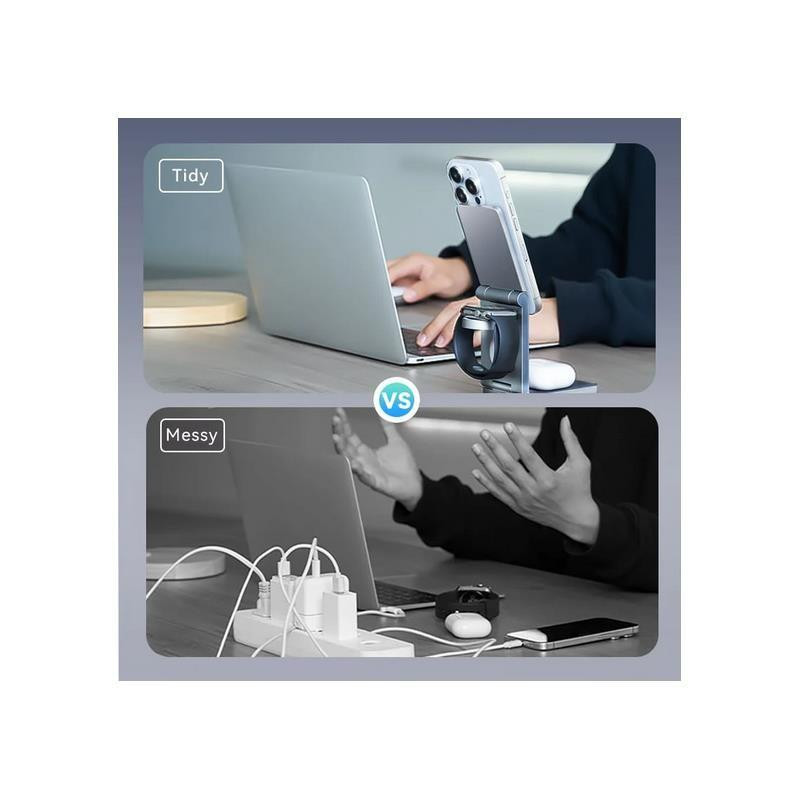 - Carga simultánea: Carga tu iPhone, Apple Watch y AirPods al mismo tiempo.