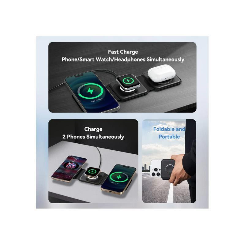 - Carga Simultánea: Carga un iPhone, Apple Watch y AirPods al mismo tiempo.