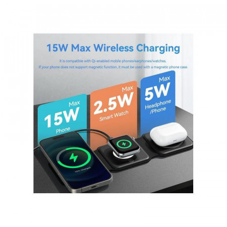 La base de carga inalámbrica 3 en 1 de Vention es la solución perfecta para mantener tus dispositivos Apple siempre listos. Diseñada para cargar simultáneamente tu iPhone, Apple Watch y AirPods, esta base combina funcionalidad con un diseño elegante y moderno.