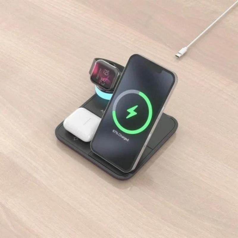 Su diseño plegable y portátil, con un ángulo ajustable de 0 a 80°, la hace perfecta para usar en escritorios, videollamadas o para revisar notificaciones mientras se cargan tus dispositivos. La base opera mediante una única entrada USB-C y admite potencias de hasta 15W en smartphones, 2.5W en Apple Watch y 5W para auriculares True Wireless, cubriendo todas las necesidades de carga en movilidad y wearables.