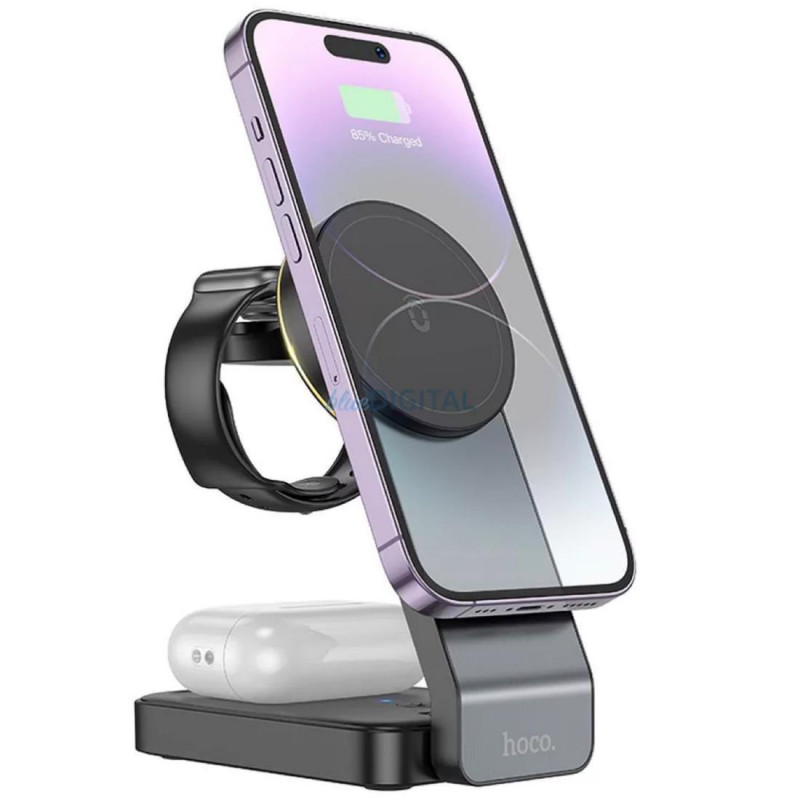 EAN 6942007602334Descubre el **Hoco CQ3 Noble**, un cargador inalámbrico de mesa que combina funcionalidad y estilo en un solo dispositivo. Este versátil cargador 3 en 1 está diseñado para satisfacer todas tus necesidades de carga, compatible con teléfonos, relojes y auriculares. Características Principales: