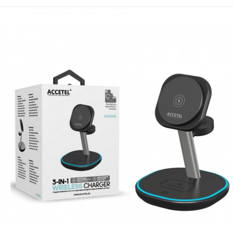 El cargador inalámbrico Accetel ACW515B redefine la comodidad de carga, ofreciendo una solución 3 en 1 para tus dispositivos esenciales. Este elegante soporte de carga en color negro está diseñado para cargar de manera eficiente tu iPhone (compatible con MagSafe), tu Apple Watch y tus AirPods o auriculares con carga Qi.