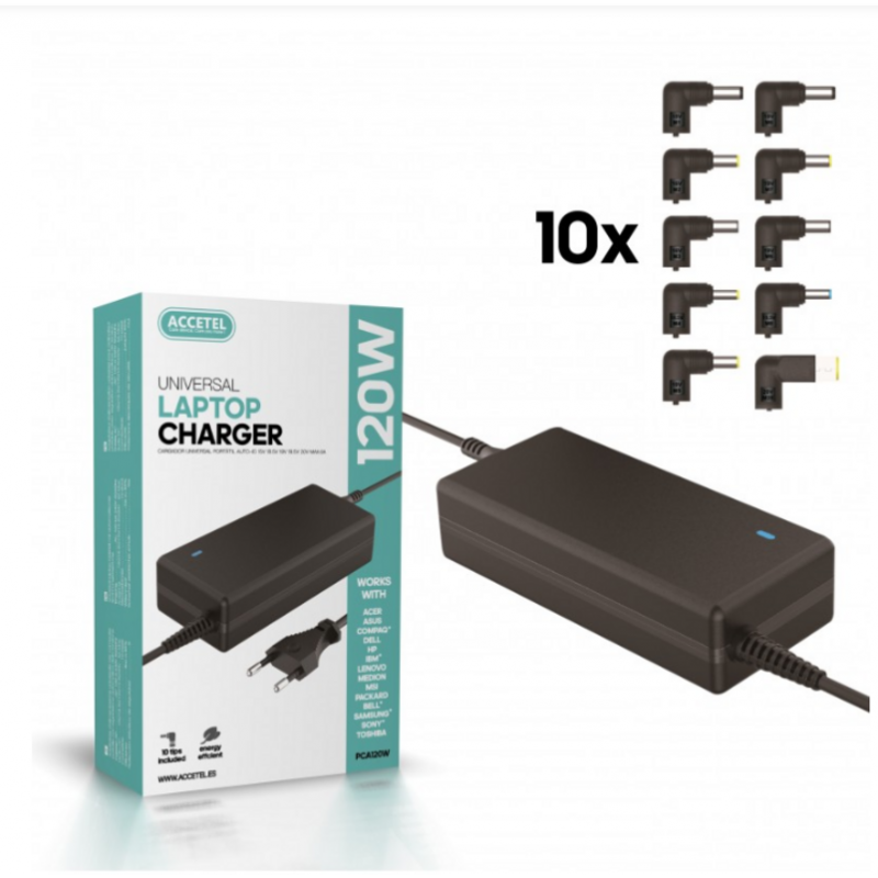 El cargador portátil universal Accetel Automático 120W (modelo PCA120W) es la solución ideal para mantener su notebook o netbook siempre con energía. Diseñado para ofrecer una compatibilidad excepcional, este cargador cuenta con un sistema de selección automática de voltaje, eliminando la necesidad de ajustes manuales y protegiendo sus dispositivos.