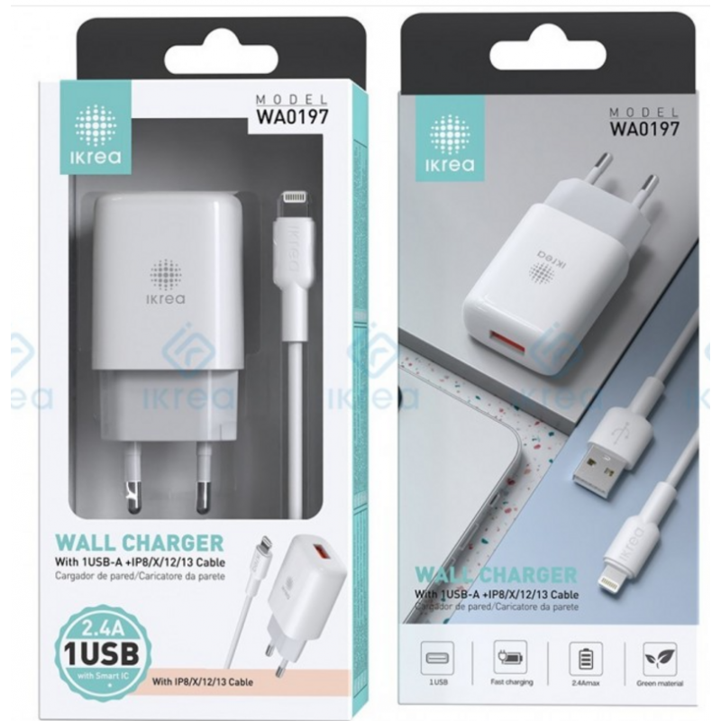 El cargador de pared Ikrea WA0197 es la solución perfecta para cargar tus dispositivos Apple de forma rápida y segura. Diseñado para ofrecer la máxima eficiencia, este cargador cuenta con una potencia de 12W y una salida de corriente de 2.4A, asegurando que tu iPhone, iPad o iPod estén listos para usar en menos tiempo.
