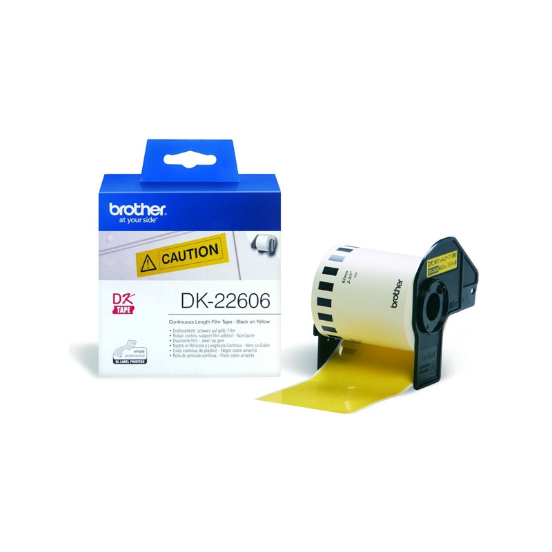La cinta de película continua Brother DK-22606 es perfecta para crear etiquetas personalizadas y llamativas. Su color amarillo vibrante asegura que tus mensajes y señalizaciones sean fácilmente visibles.