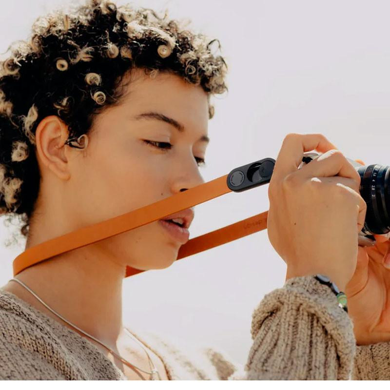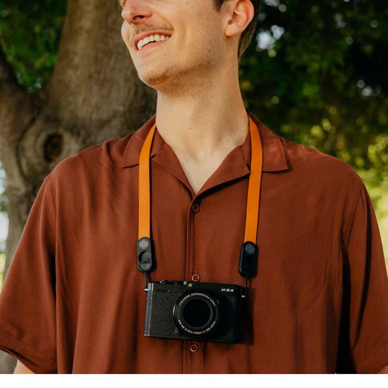 Su diseño ergonómico se adapta al contorno del cuello, distribuyendo el peso de la cámara de manera uniforme para reducir la fatiga durante largas sesiones fotográficas. El cuero de alta calidad en color ámbar añade un toque de elegancia y sofisticación a tu equipo.