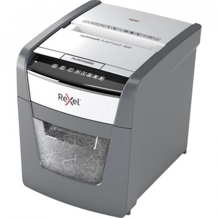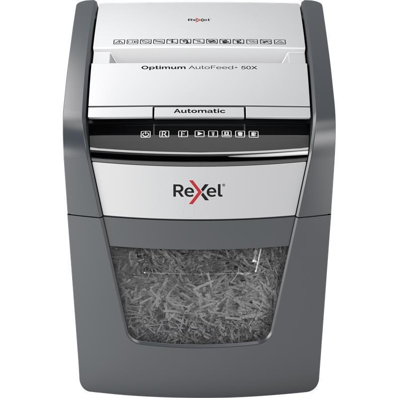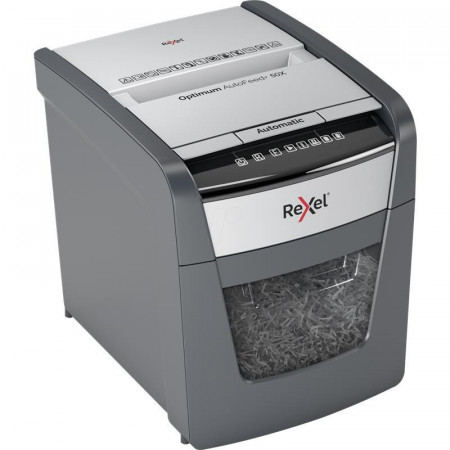 La destructora de partículas Rexel Optimum Autofeed+ 50X destruye automáticamente hasta 50 hojas de papel A4 (80 g/m²) a la vez, transformándolas en piezas de corte transversal P4 (4 x 28 mm).